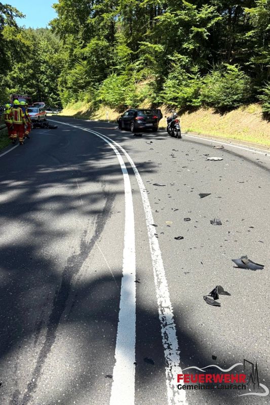 Am heutigen Sonntag, 10.08., kam es am frühen Nachmittag auf der B26 zwischen Hain und den „Sieben Wegen“ zu einem schweren Verkehrsunfall. Ein Motorradfahrer verlor die Kontrolle über sein Fahrzeug und prallte frontal mit einem entgegenkommenden Pkw zusammen. Der Motorradfahrer erlitt dabei schwere Verletzungen, die beiden Pkw-Insassen wurden leicht verletzt.