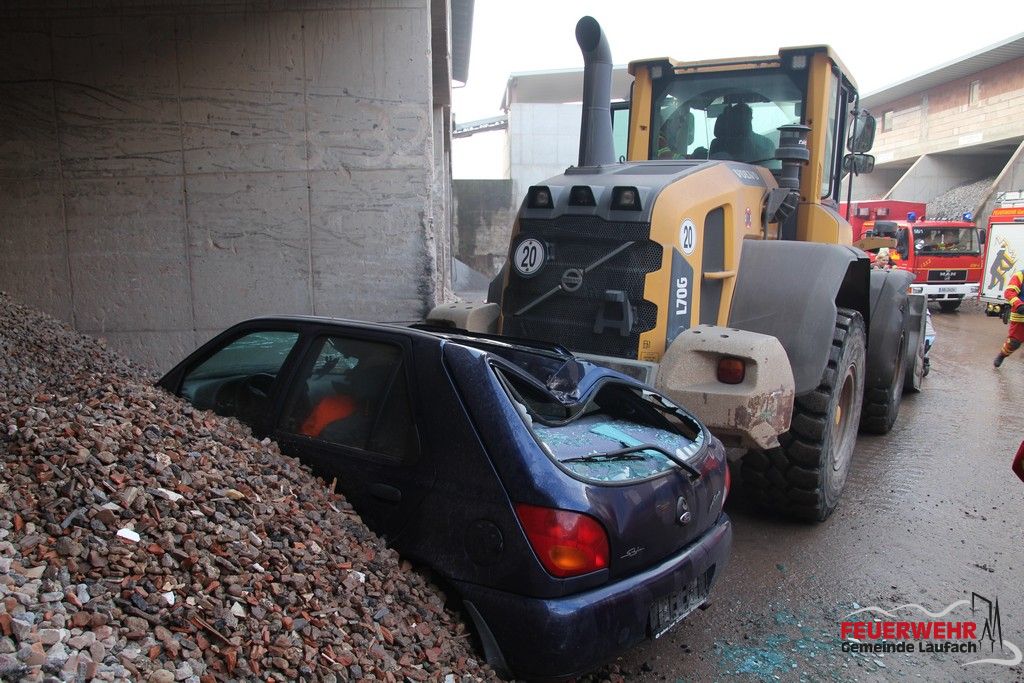 • Durch die Verpuffung erschrak der Fahrer eines Radladers und fuhr rückwärts statt vorwärts. Dabei rammte er einen vorbeifahrenden Pkw und schob diesen gegen einen Schotterhaufen