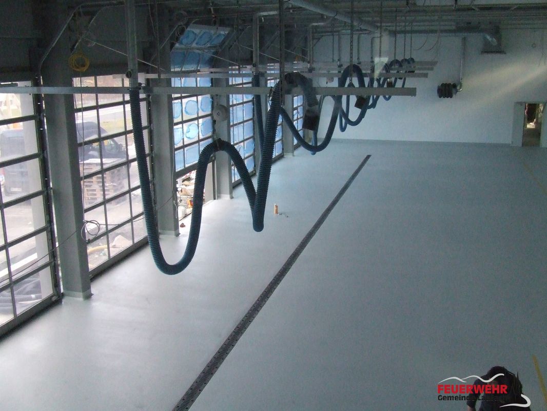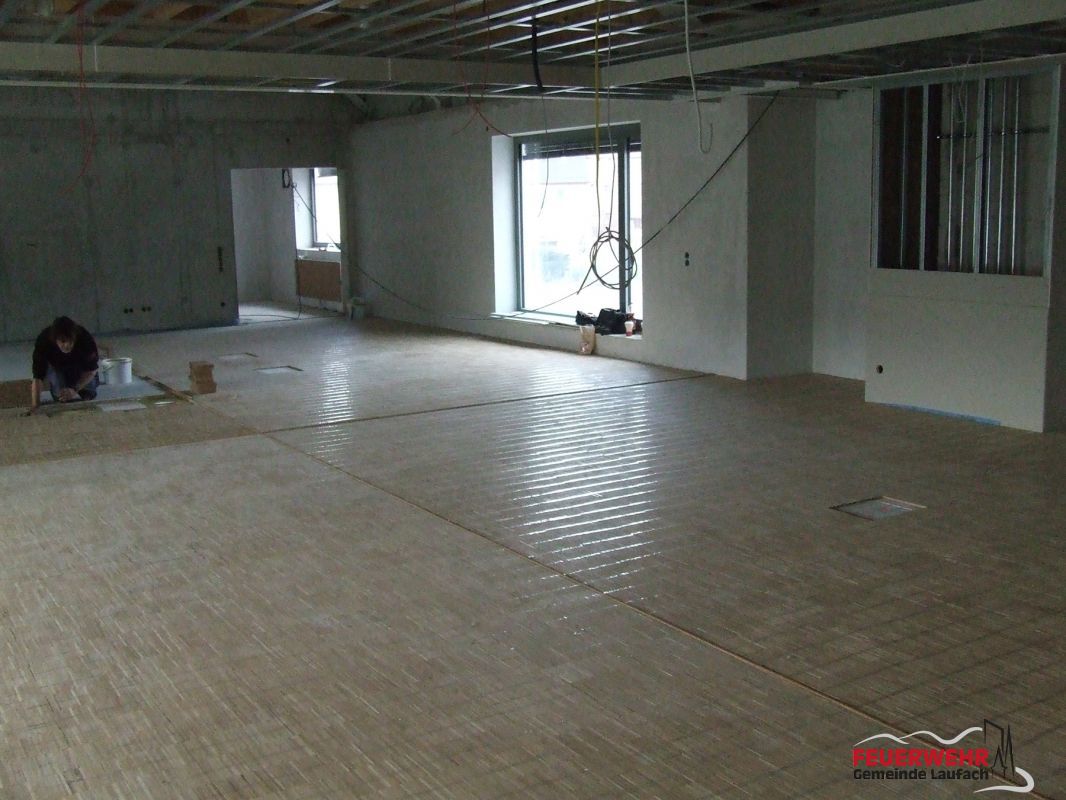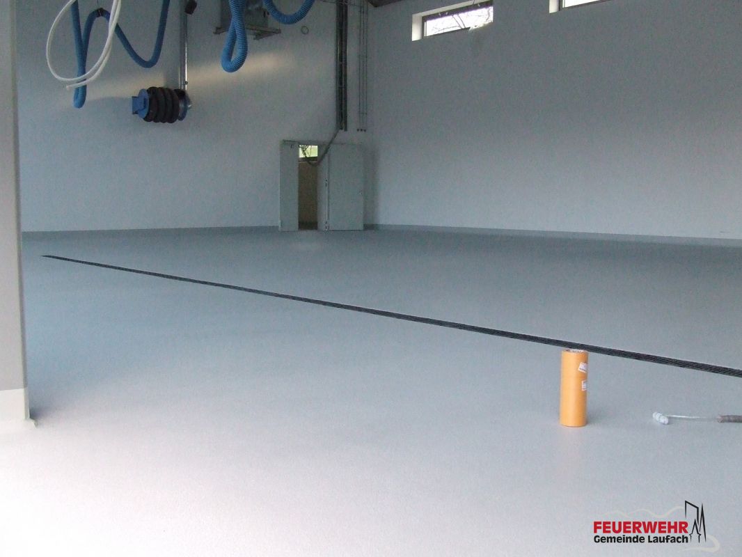 Der Fußboden der Fahrzeughalle wurde beschichtet und das Stäbchenparkett wurde gelegt.