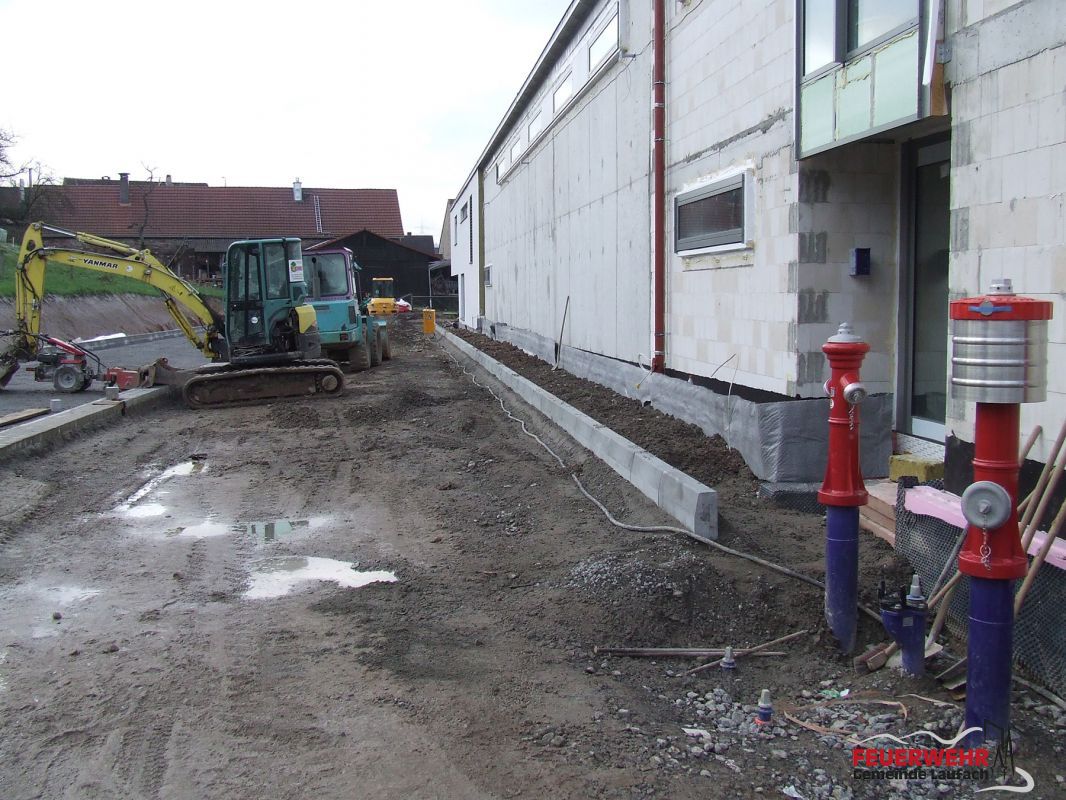 Auf der Rückseite des Gerätehauses schreiten die Arbeiten für die Umfahrung und Parkplätze weiter voran.
