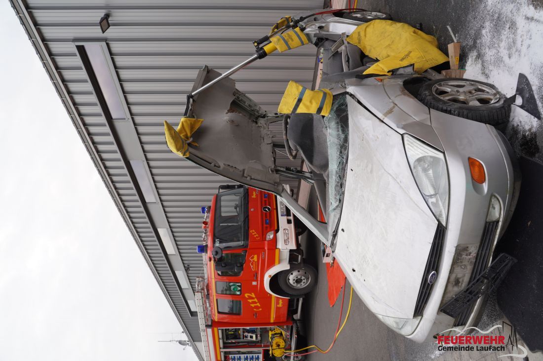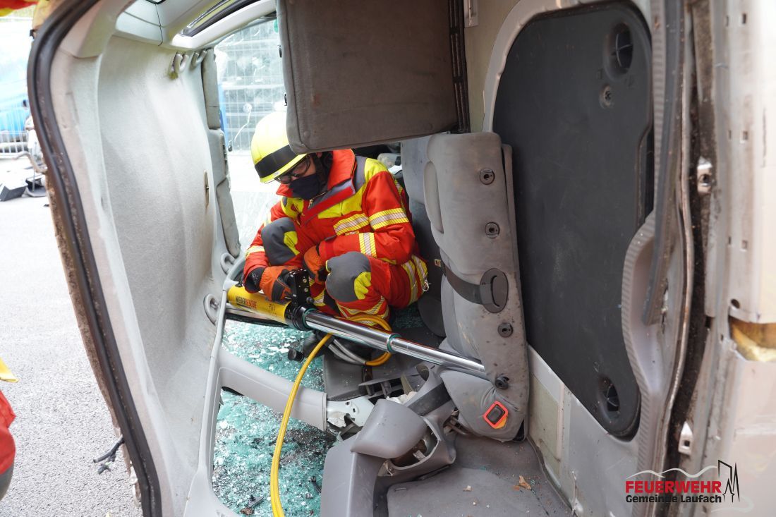 In einer Kleingruppe wurden verschiedenen Einsatzszenarien an einem verunfallten Fahrzeug durchgespielt.