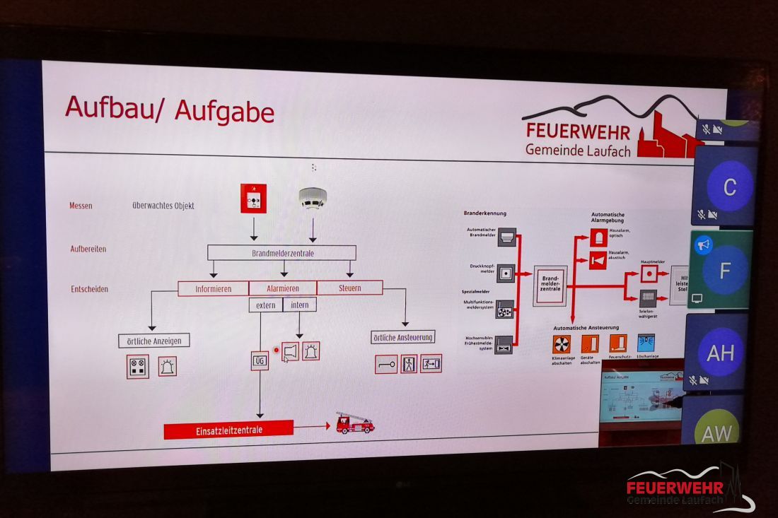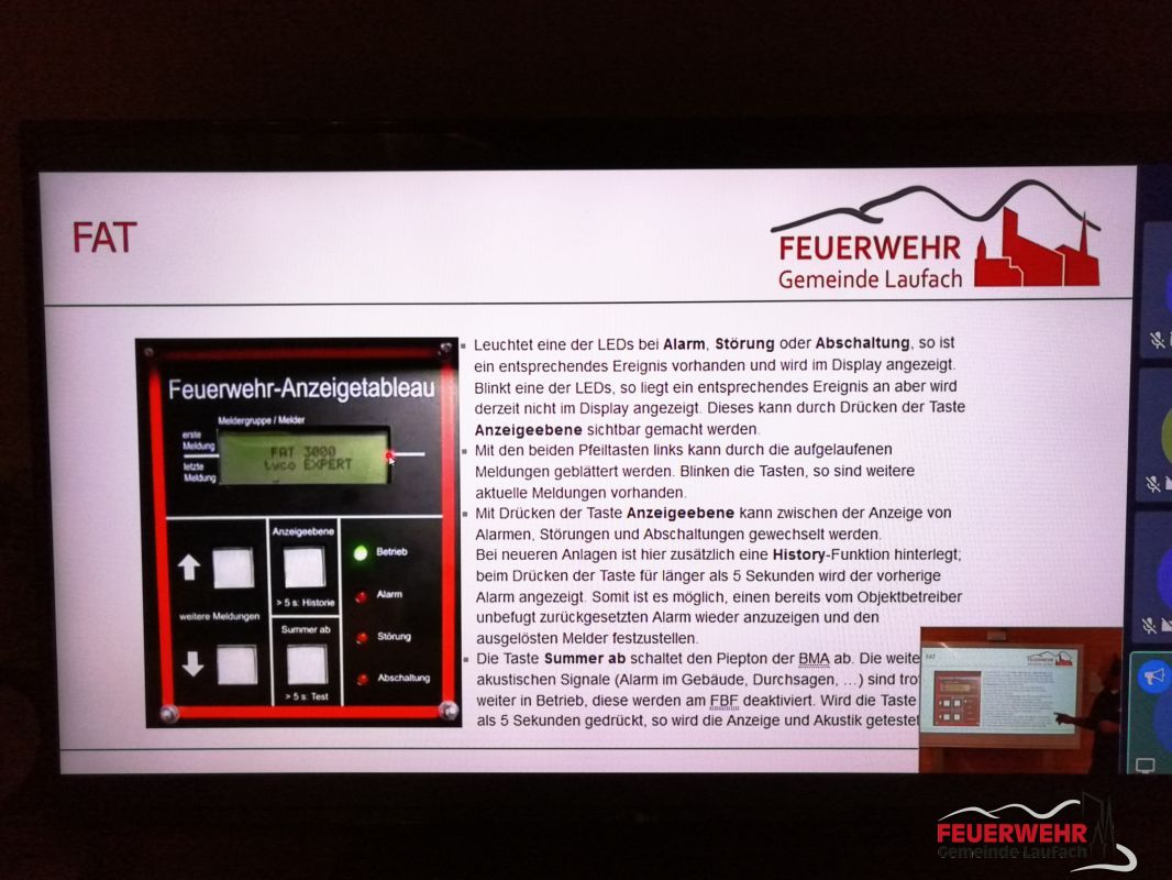Am Freitag, den 04.12.2020 fand dann der erste Online-Schulungsabend bei der Feuerwehr Gemeinde Laufach statt. Dem Thema Brandmeldeanlage (kurz BMA) haben sich die beiden Feuerwehrkameraden Frank und Heinz-Xaver angenommen und dieses auf eine neue Art und Weise für die Kameraden vorbereitet. Im Vorfeld haben Sie ein 45-minütige Video erstellt, in dem die Grundlagen und Vorgehensweise bei einer Alarmmeldung mit BMA ausführlich anhand vom BMA-Übungskoffer und der vorhandenen BMA im Feuerwehrhaus Laufach erklärt werden.