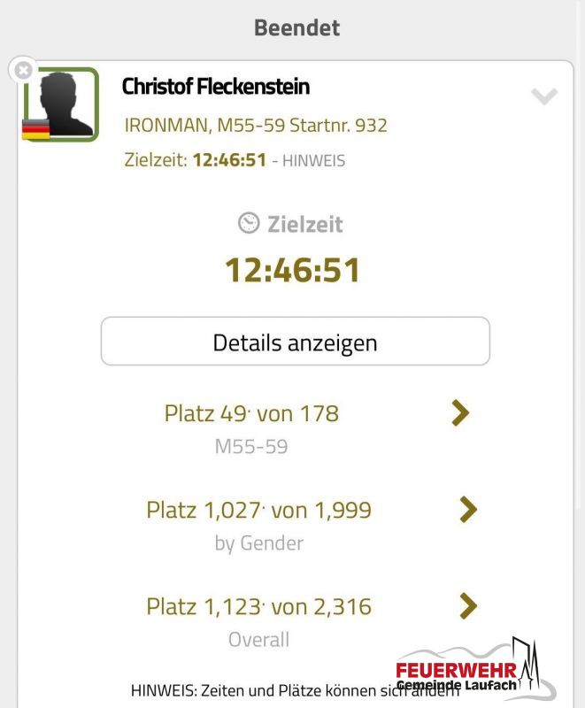 Mit einer Gesamtzeit von 12:46:51 belegte er Platz 49 seiner Altersklasse M55, und kam als 1123. von 2316 Finishern ins Ziel.