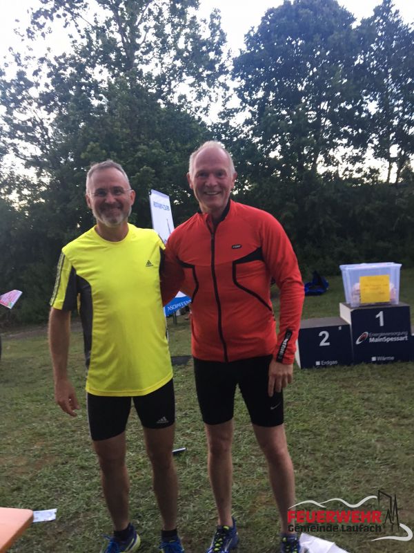 Zum Start des 10 km-Hauptlaufs gab es zwei Böllerschüsse (das waren die in ganz Unterfranken für Aufregung sorgenden Kampfjets der Bundeswehr…).Tobias Wileschek ging ab wie die Feuerwehr –und kam mit 41:36 als 26. Ins Ziel aufs Treppchen als dritter seiner Altersklasse M40. Bernd Herbert erzielte 43:33 (40. Platz; 8.M45). Christof Fleckenstein und Christian Strecker nahmen den Lauf als lockere Trainingseinheit für Sonntag und überquerten nach 56:54 gemeinsam die Ziellinie (236. bzw. 237. Platz; 32. bzw. 33. der AK M50). Glückwunsch auch an die weiteren Laufacher Mitstarter Uta und Werner Kellmann, Evi Schneiderbanger, Jürgen Bacher und Johannes Vetter - hat trotz des Sturms und Regens bei der After-Race-Party viel Spaß gemacht!