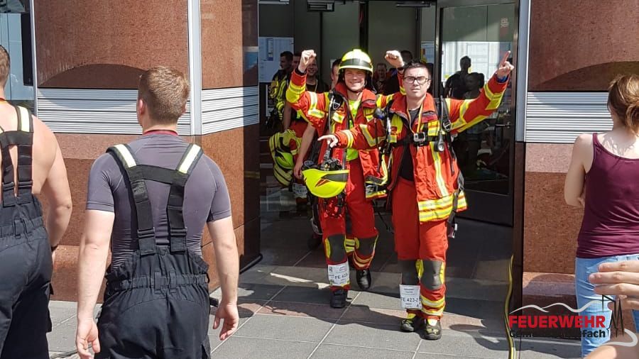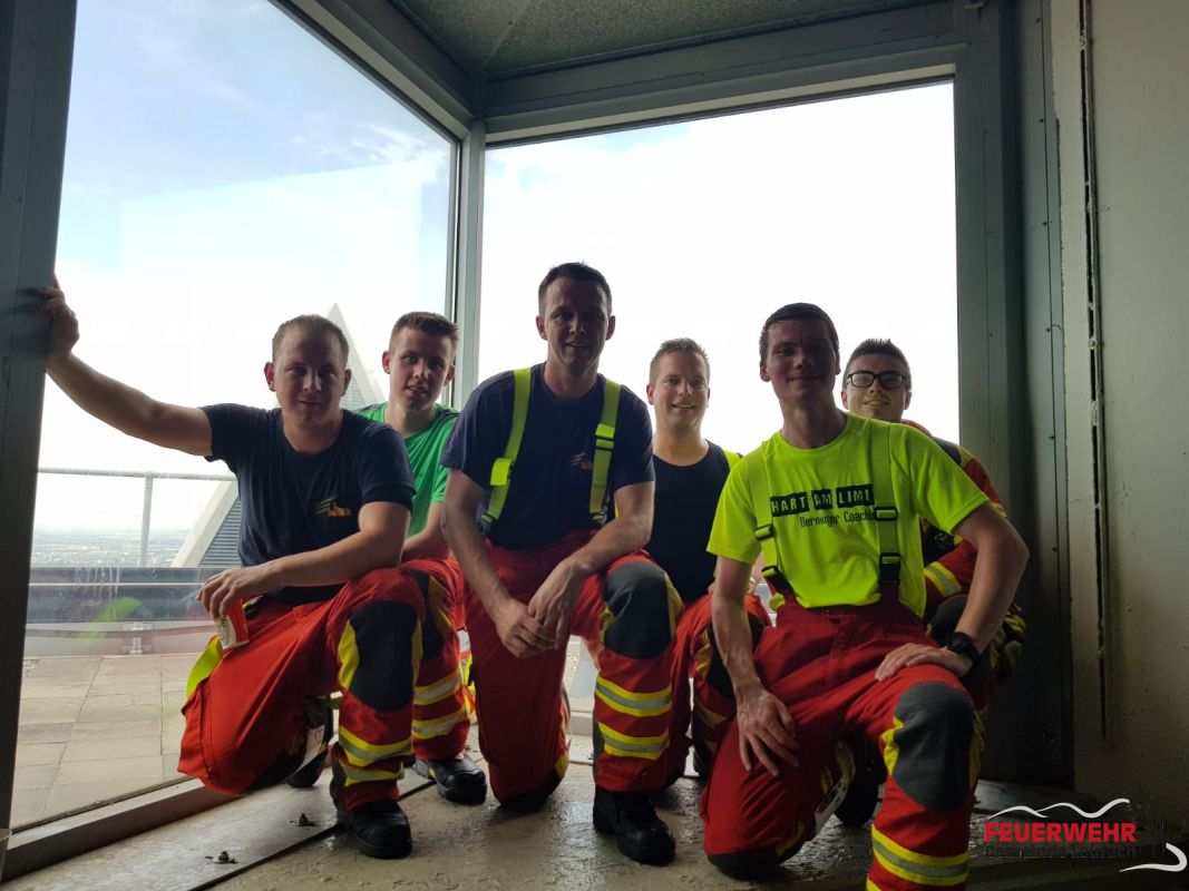 In kompletter einsatztauglicher Schutzkleidung (Stiefel, Hose, Jacke, Helm) und mit angeschlossenem Atemschutzgerät - die Handschuhe mussten nur mitgetragen werden - ging es die 1202 Stufen bis ins 61 Stockwerk nach oben.