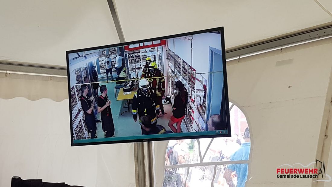 Die Zuschauer konnten unten in einem Zelt mittels Webcam in den 30. Stock und ins Ziel schauen. (Hier Team 1 gemeinsam im 30. Stock, sowie André und Sebastian beim Zieleinlauf)
