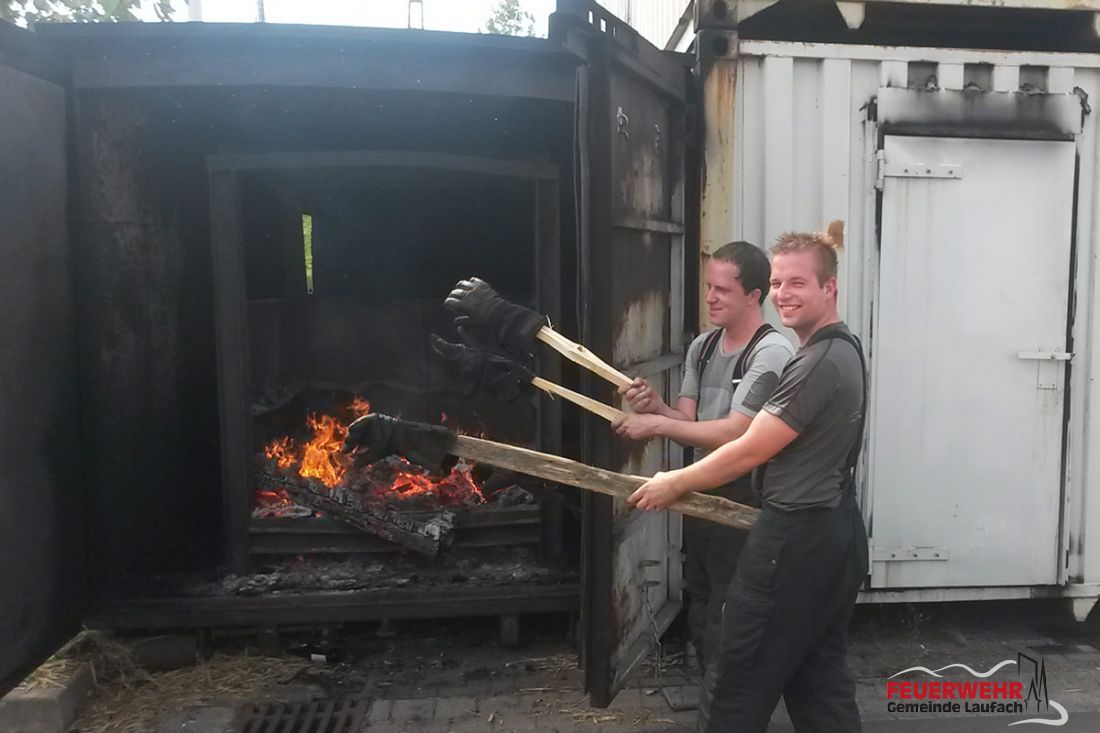Im zweiten Durchgang musste ein 30m C-Schlauch zuerst durch den Parcours im Container gezogen werden, dann wurden der Temperaturcheck an der Tür zum Brandraum durchgeführt. Direkt dem Feuer gegenüberstehend wurde mittels Hohlstrahlrohr der Brand eingedämmt, aber für die nächsten Teilnehmer noch nicht komplett gelöscht.