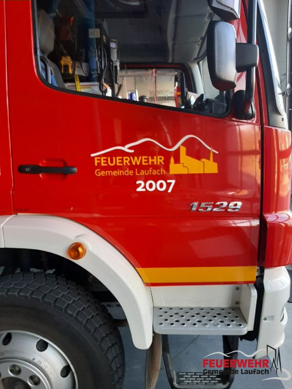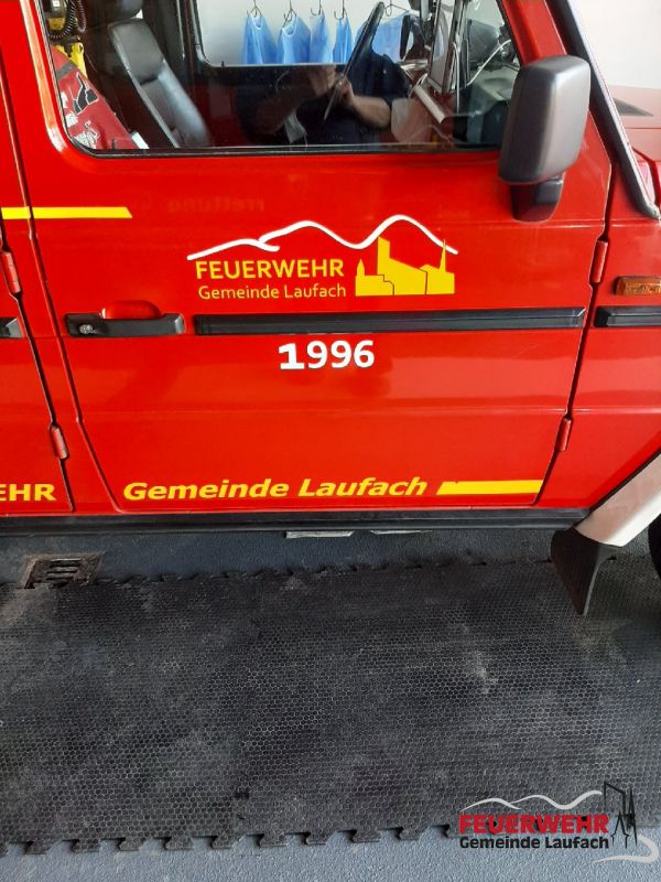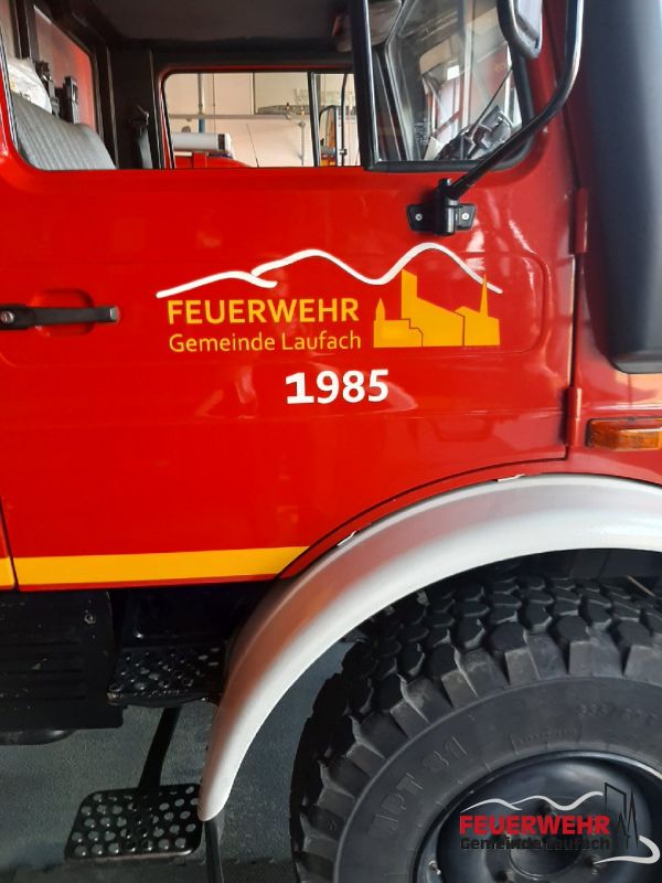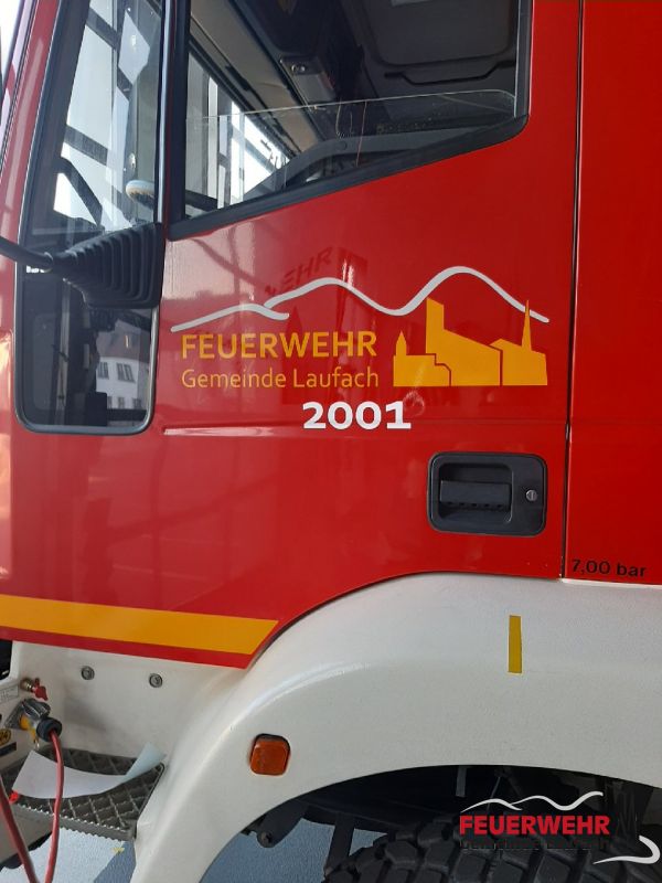 Mit der Beschriftung ist nun für jedermam ersichtlich, welche modernen, aber auch "quasihistorischen" Fahrzeuge im Bestand der FEUERWEHR Gemeinde Laufach sind.