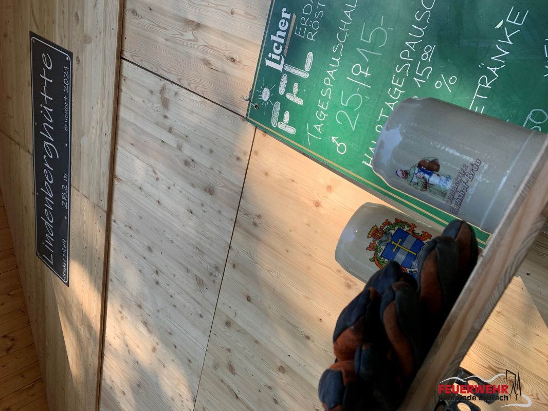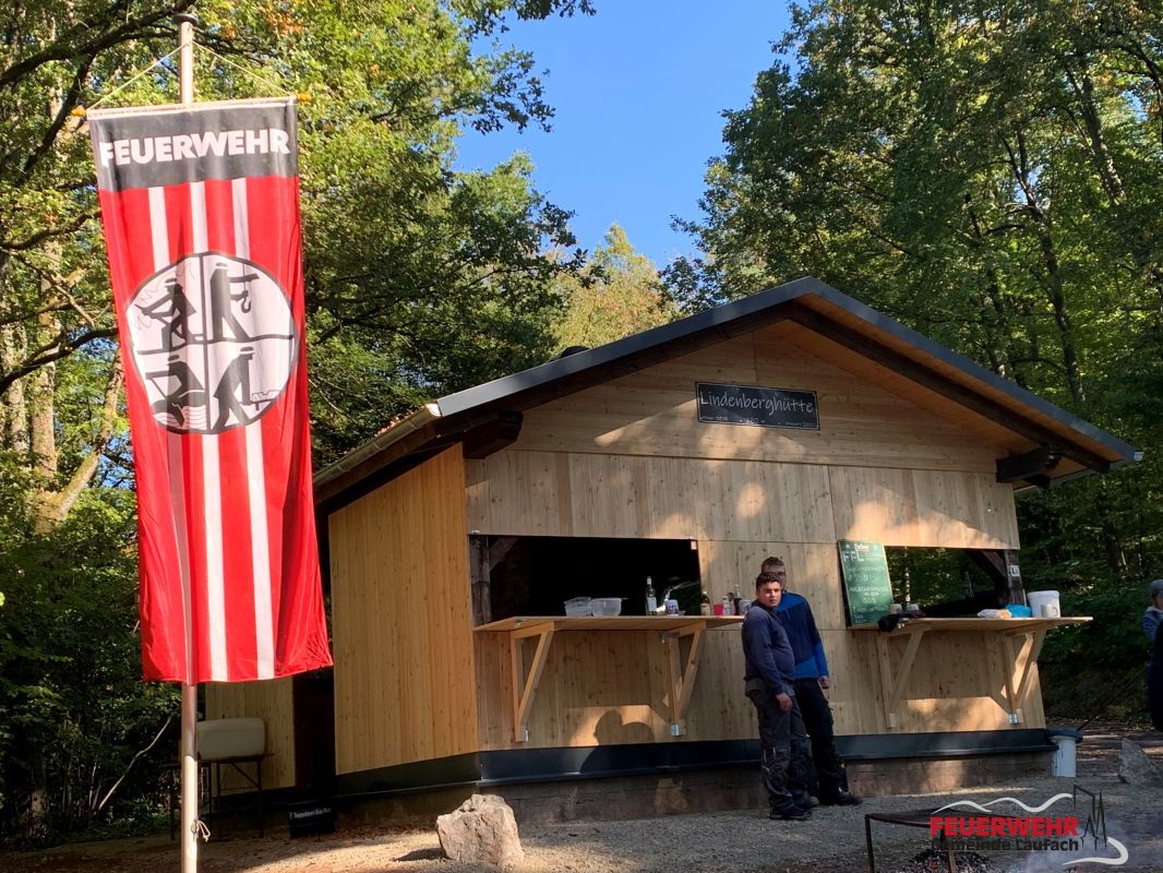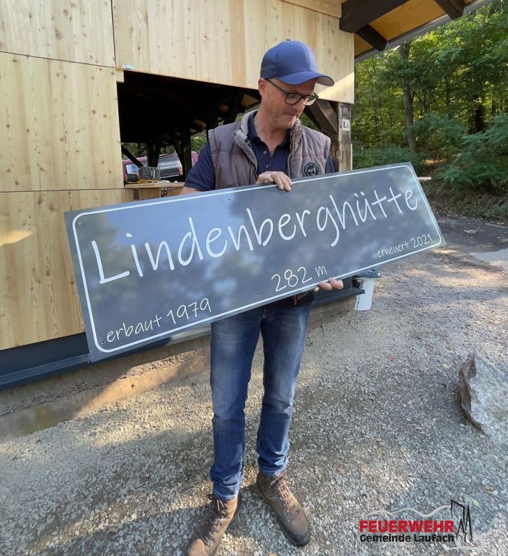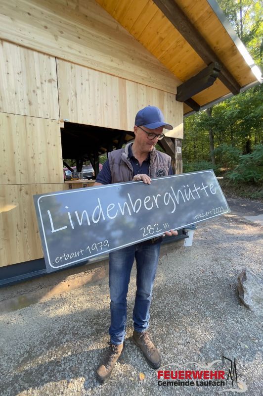 Erster Nutzer war konsequenterweise auch der Feuerwehrverein Laufach e.V. zum seinem traditionellen Familienkartoffelbraten am 9. Oktober 2021. An diesem Tag (standesgemäß bei Bier und Lakefleisch) wurden das Areal und das Mobiliar vom Verein an die Gemeinde zu seiner Bestimmung übergeben. Symbolisch überreichte der Vorsitzende Christian Strecker das Hüttenschild an Bürgermeister Friedrich Fleckenstein. Die Montage erfolgte dann unmittelbar im Anschluss.