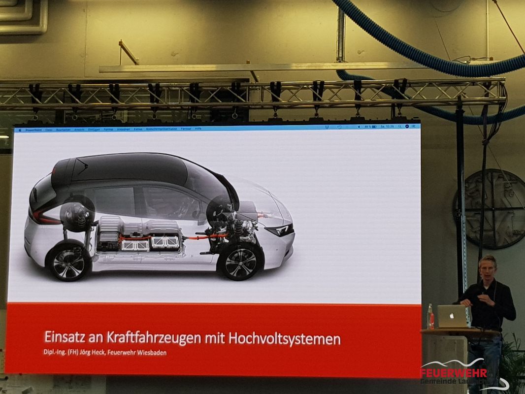 Nach einer kurzen Frühstückspause stellte Jörg Heck von der Berufsfeuerwehr Wiesbaden mögliche Löschkonzepte zur Brandbekämpfung bei Akkubränden und Kraftfahrzeug mit Hochvolt-System vor.