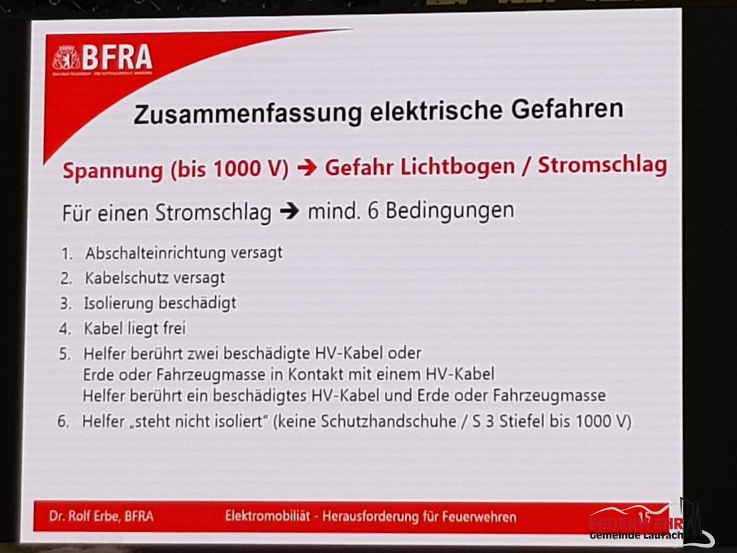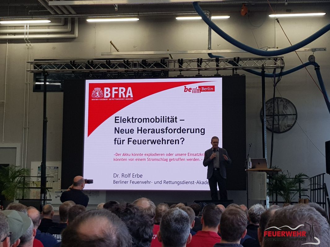 Nach einer kurzen Begrüßung durch den verantwortlichen KBI Frank Wissel startete direkt Dr. Rolf Erbe von der Berliner Feuerwehr- und Rettungsdienst-Akademie. In seinem Vortrag zur „Elektromobilität – Neue Herausforderung für die Feuerwehr?“ zeigte er die Parallelen zu einem „Standard-Feuerwehreinsatz“ auf und berichtete hier von seiner Einsatzerfahrungen aus der Berliner Berufsfeuerwehr. Er erläuterte die Gefahr eines Lichtbogens oder Stromschlag für die Einsatzkraft und ging auf die mindestens 6 notwendigen Bedingungen ein, damit dies überhaupt möglich ist: