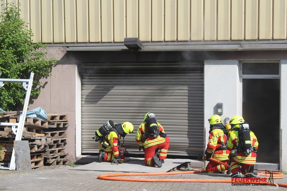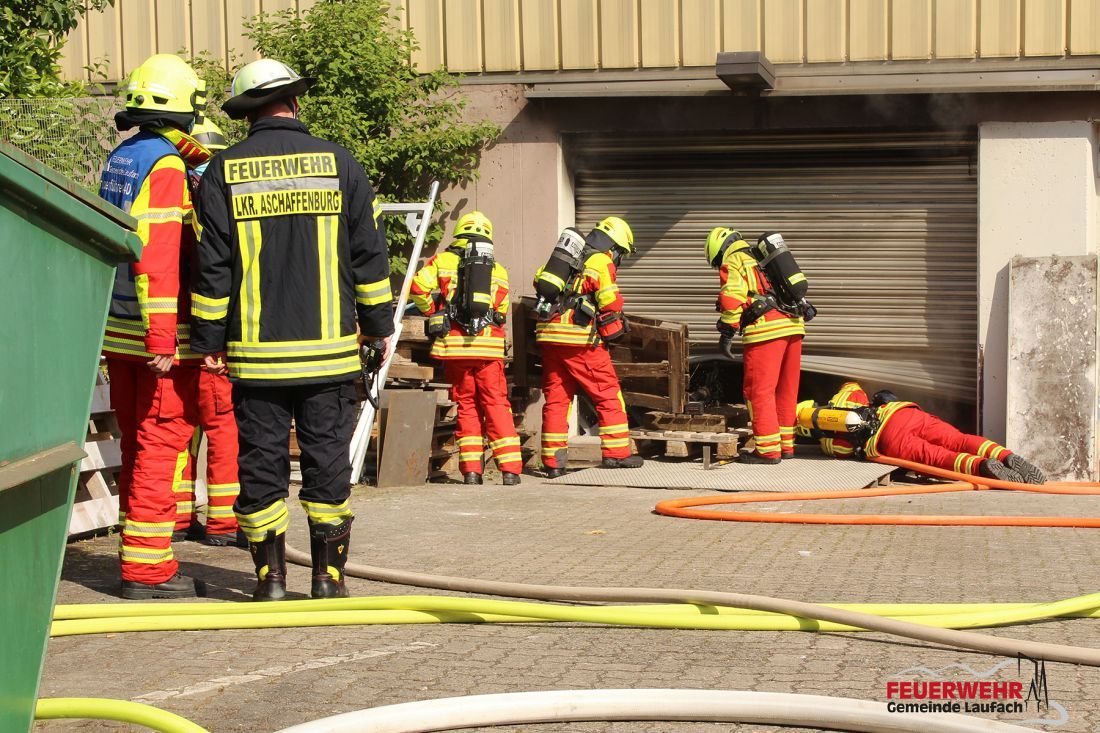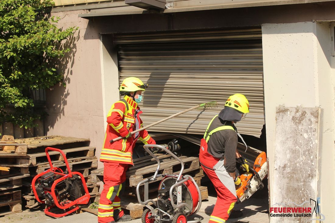 Das Gebäude wurde durch Einsatzkräfte der BRK Bereitschaft Laufach und der Polizei geräumt. Fünf Personen konnten das Gebäude unverletzt verlassen. Der Brandbereich konnte rasch lokalisiert werden. Neben einer normalen Zugangstüre verschafften wir uns Zugang über ein elektrisches Garagentor, welches zunächst mit einem Spreizer, im weiteren Verlauf mit einem Motortrennschneider geöffnet wurde.