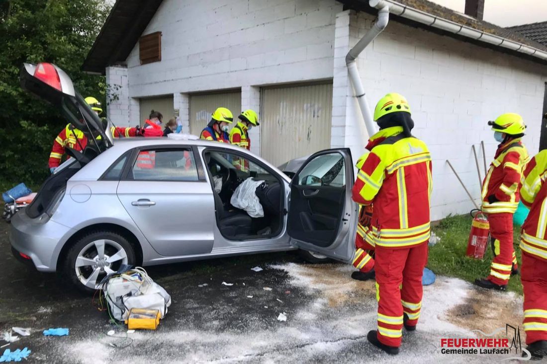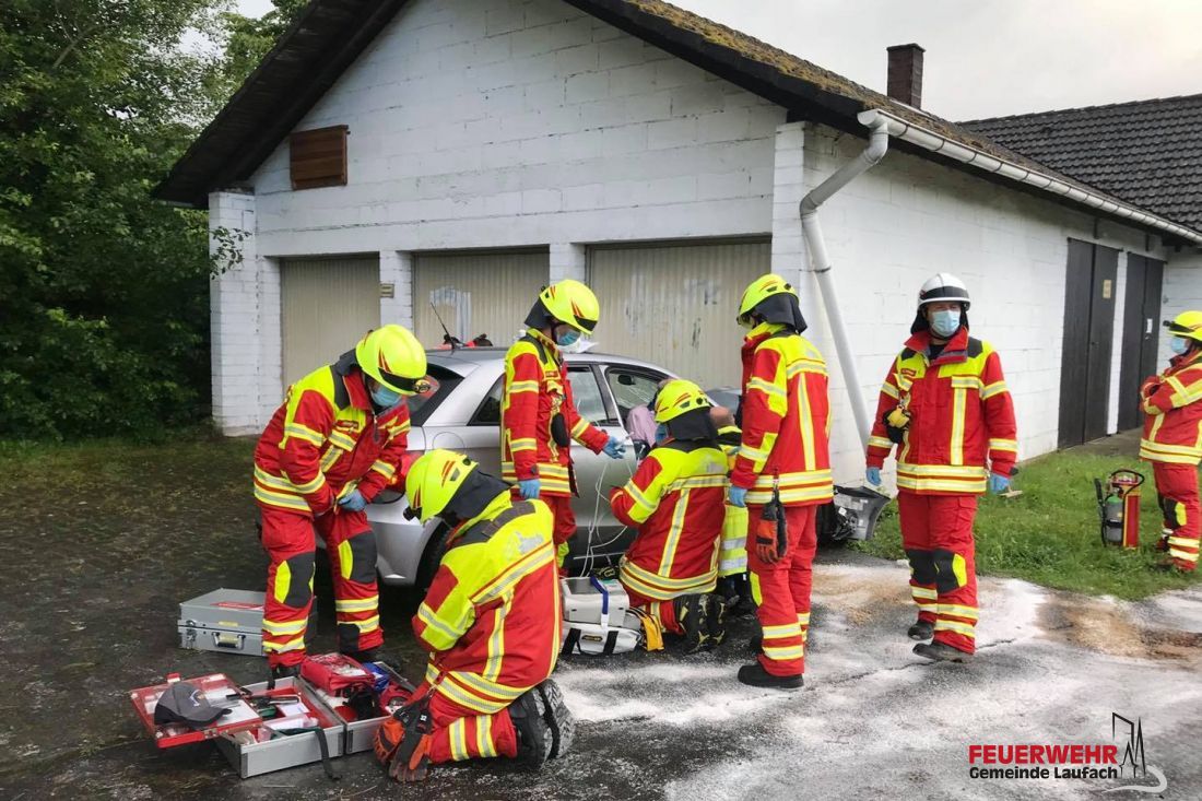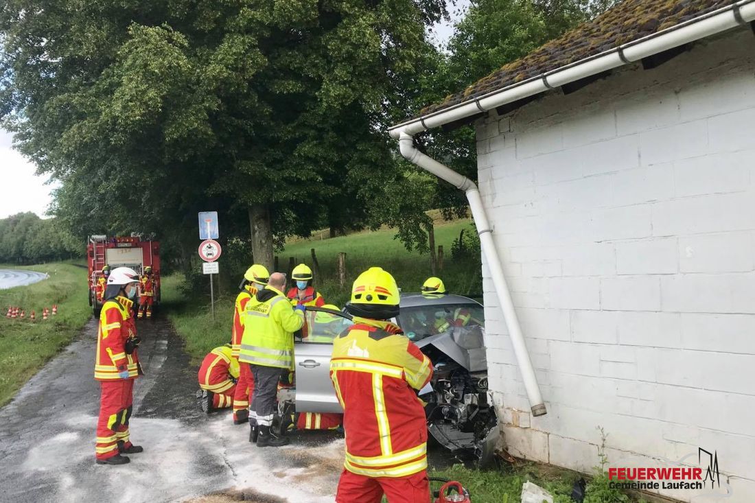 Zu einem schweren Verkehrsunfall kam es am Abend des 19. Juni 2020, pünktlich zu Beginn unserer Übung: Gegen 19 Uhr kam ein aus Richtung Hain kommender PKW kurz vor dem Ortseingang Laufach aus unbekannter Ursache nach links von der Fahrbahn ab, kollidierte mit dem Schachtbauwerk des Oberflächenwasserkanals, kreuzte einen, parallel zur Fahrbahn verlaufenden, Radweg und schlug letztendlich an einem Nebengebäude des BRK-Heims (Garagenanlage) ein.