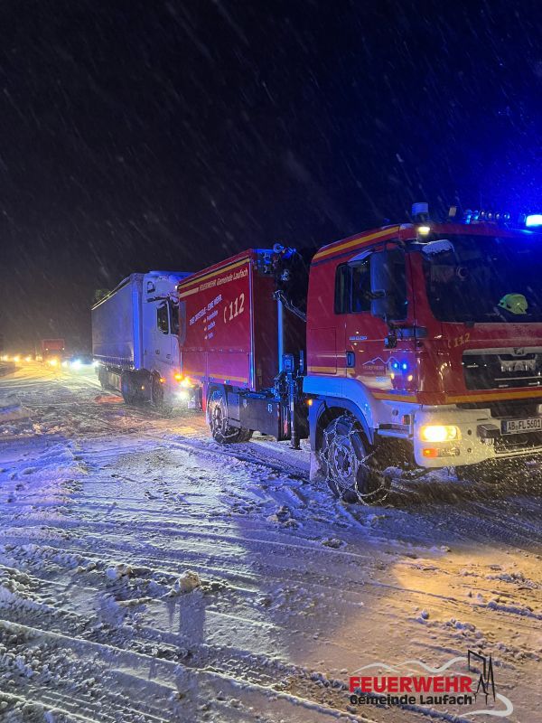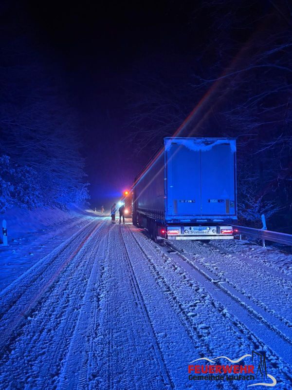 Aufgrund starker Schneefälle blieb kurz vor 6 Uhr ein Lkw auf der B 26 zwischen Laufach-Hain und der Kreuzung Sieben Wege stecken.