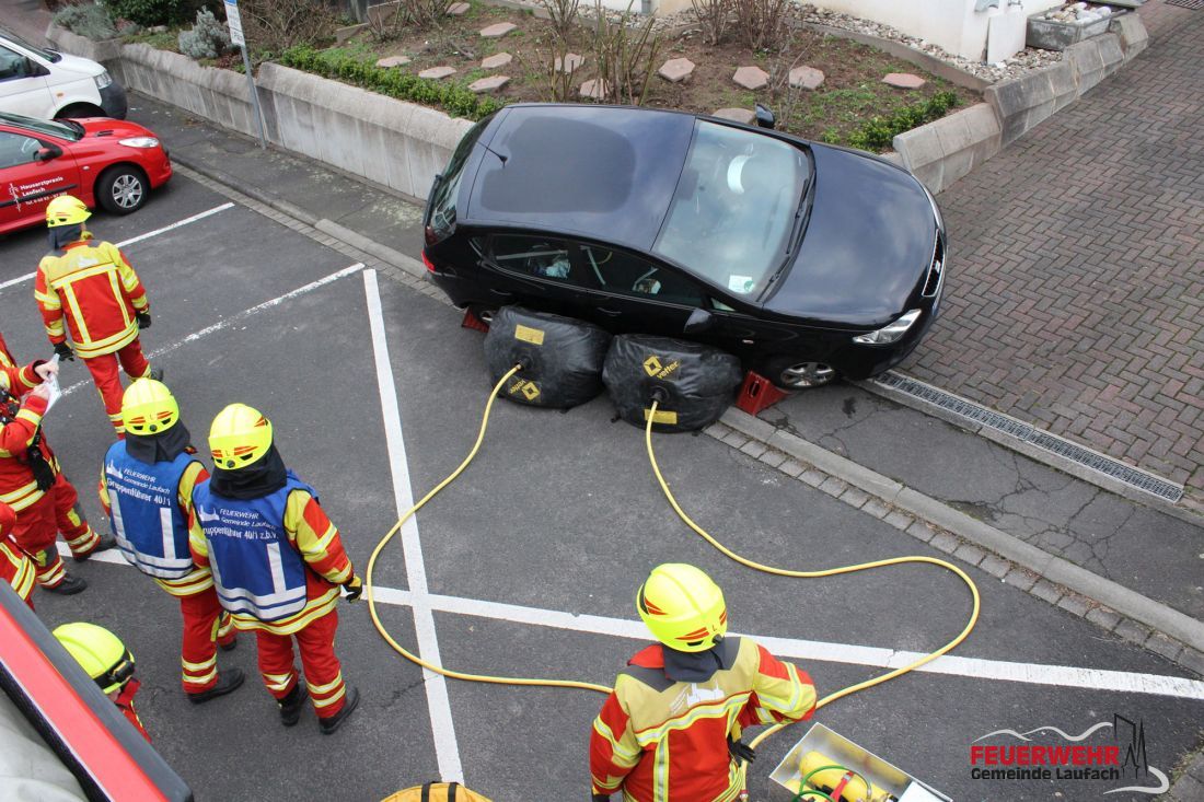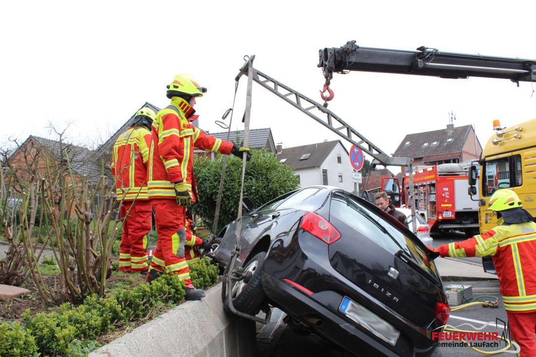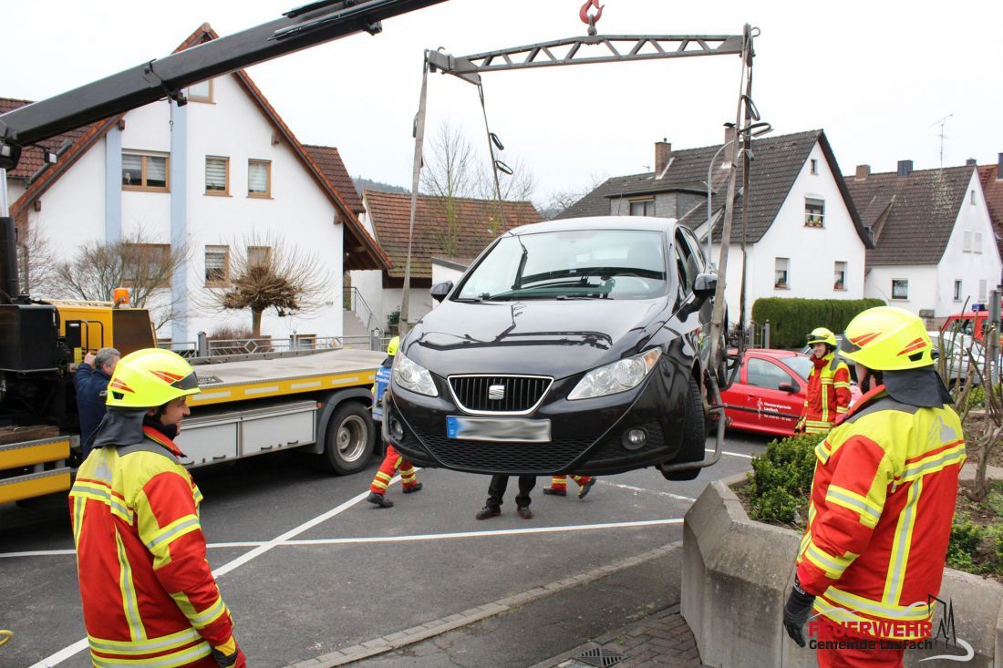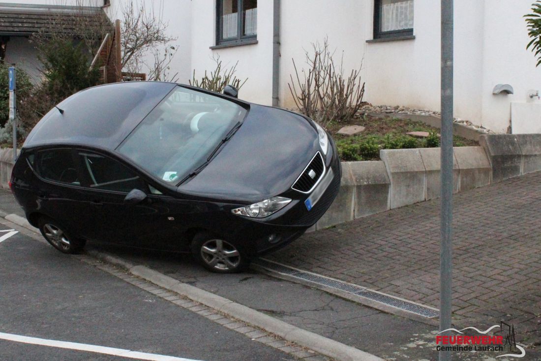„PKW droht abzustürzen“ lautete die Alarmmeldung der ILS. Beim Eintreffen der FEUERWEHR Gemeinde Laufach bot sich folgendes Bild: Ein PKW war durch einen Fahrfehler auf einer abschüssigen Hofeinfahrt rückwärts auf die Stützmauer aufgerollt und blieb schließlich in beeindruckender Schräglage stehen. Die Fahrerin konnte sich unverletzt befreien.