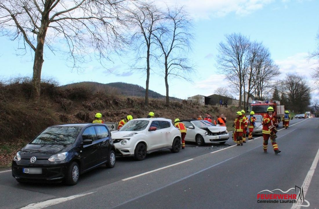 Um 16.54 Uhr wurde die FEUERWEHR Gemeinde Laufach zu einem Verkehrsunfall auf die B26 zwischen Frohnhofen und den Weiberhöfen alarmiert. Dort kam es beim Linksabbiegen zu einem Auffahrunfall von insgesamt vier Fahrzeugen.