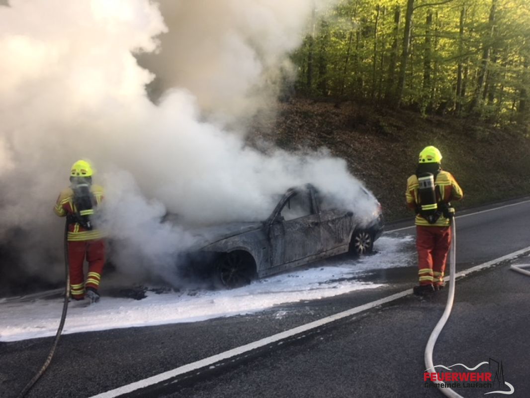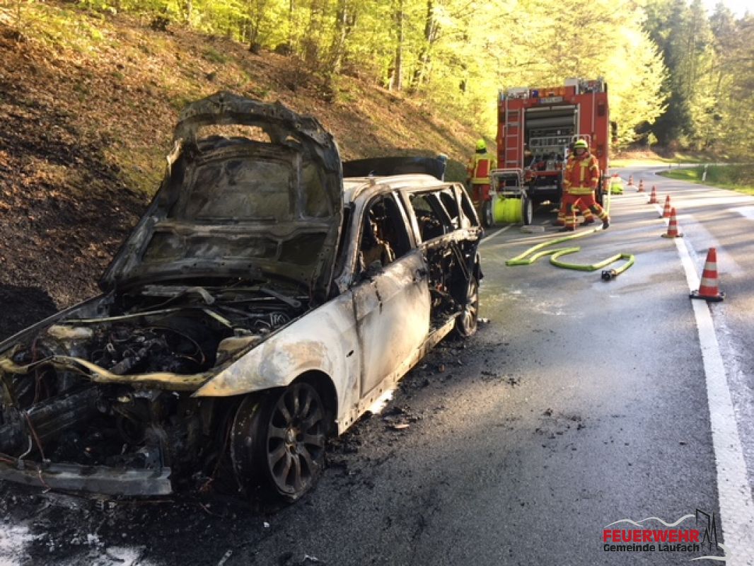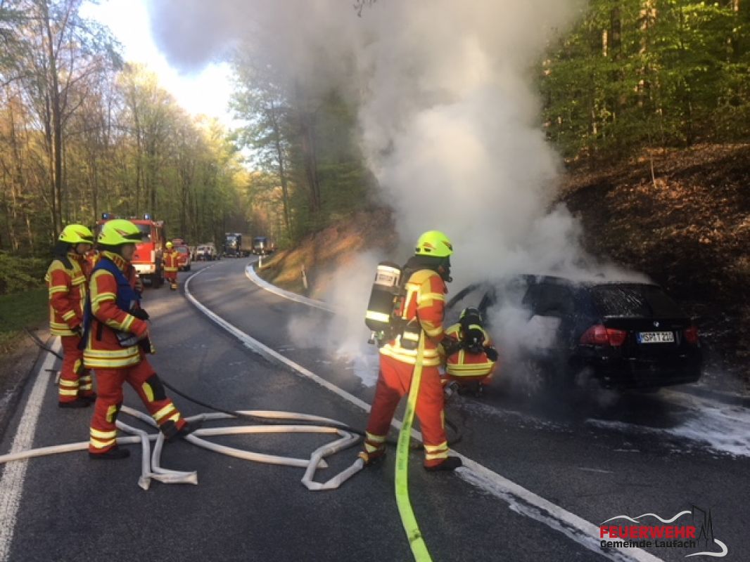 Brennender PKW zwischen Hain und den Sieben Wegen: Beim Eintreffen der FEUERWEHR Gemeinde Laufach stand das Fahrzeug im Vollbrand, die Flammen hatten auch auf die angrenzende Waldböschung übergegriffen. Der Fahrer hatte Rauchentwicklung im Motorraum bemerkt und das Fahrzeug unverletzt verlassen können.