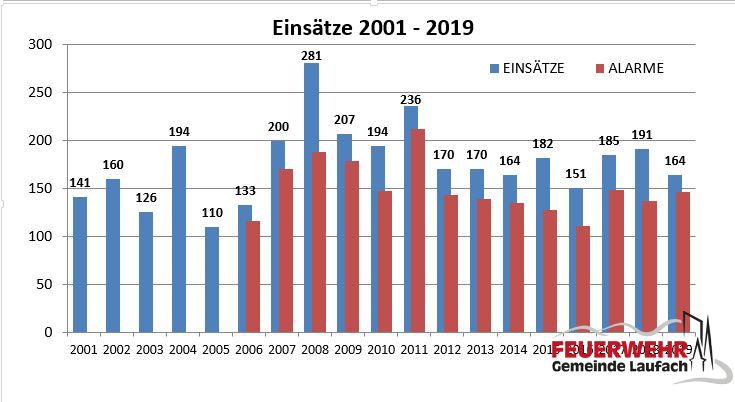 Zu 164 Einsätzen musste die FEUERWEHR Gemeinde Laufach ausrücken – 27 weniger als im Vorjahr und damit geringfügig unter dem Durchschnitt der neun Vorjahre (175).
