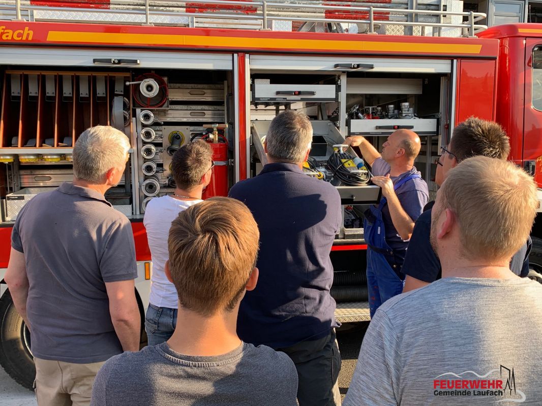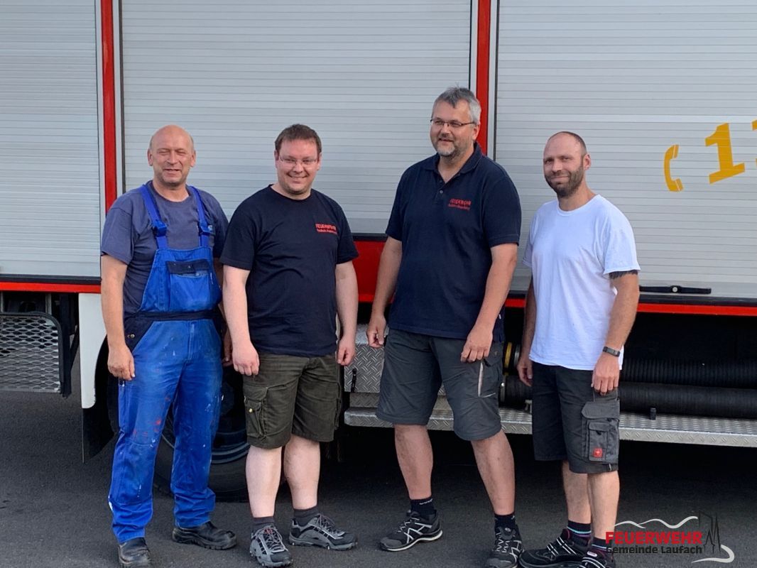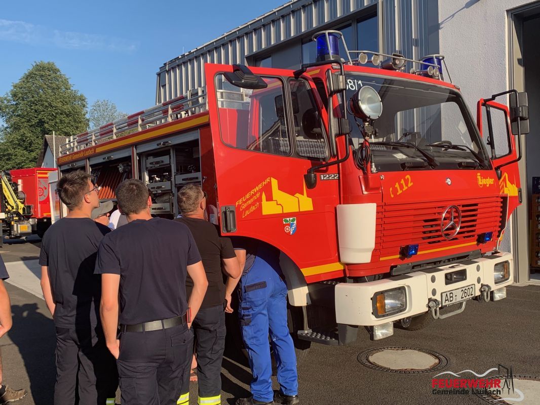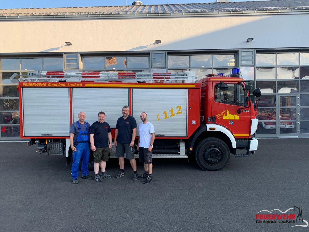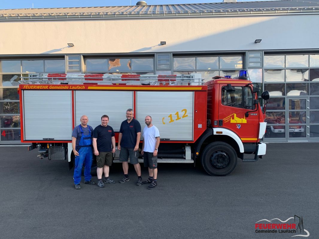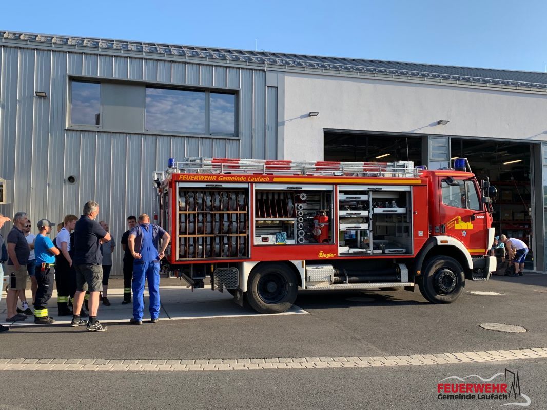 Eine Delegation der Feuerwehr Feldkahl-Rottenberg nahm das Fahrzeug am Feuerwehrhaus Laufach entgegen. Anwesend waren auch viele Laufacher Kameradinnen und Kameraden, da zu diesem Zeitpunkt technischer Dienst angesetzt war.