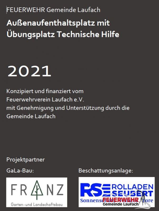 Die ursprüngliche Planung zur Freiflächengestaltung des 2018 errichteten Feuerwehrhauses sah auch einen Aufenthaltsplatz im Außenbereich vor, sowie eine Umfassung der südlich neu gepflanzten Bäume mit Quadersteinen. Leider fielen diese Umfänge Kosteneinsparungen zum Opfer. Letztlich wurde nur eine provisorische wassergebundene Fläche angelegt, die durch eine vom Feuerwehrverein Laufach beschaffte Lagerbox für Grillgerät ergänzt wurde.