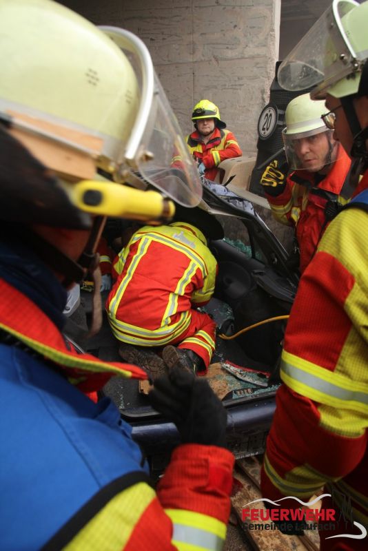 Mit hydraulischen Geräten wurde zuerst Platz für den Einstieg eines innerern Retters geschaffen, dabei das Kleinkind aus dem Fahrzeug befreit und an das BRK übergeben. Im Anschluss galt es, die beiden Erwachsenen auf den vorderen Sitzen achsengerecht aus dem Fahrzeug zu holen.