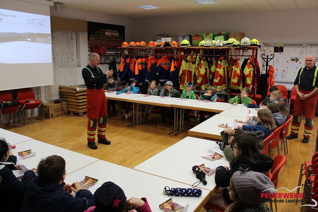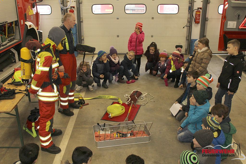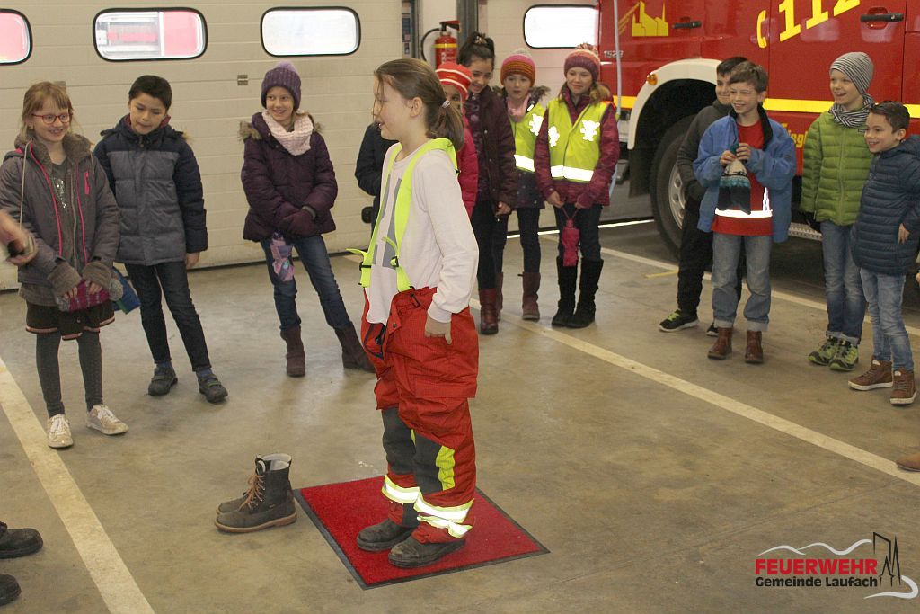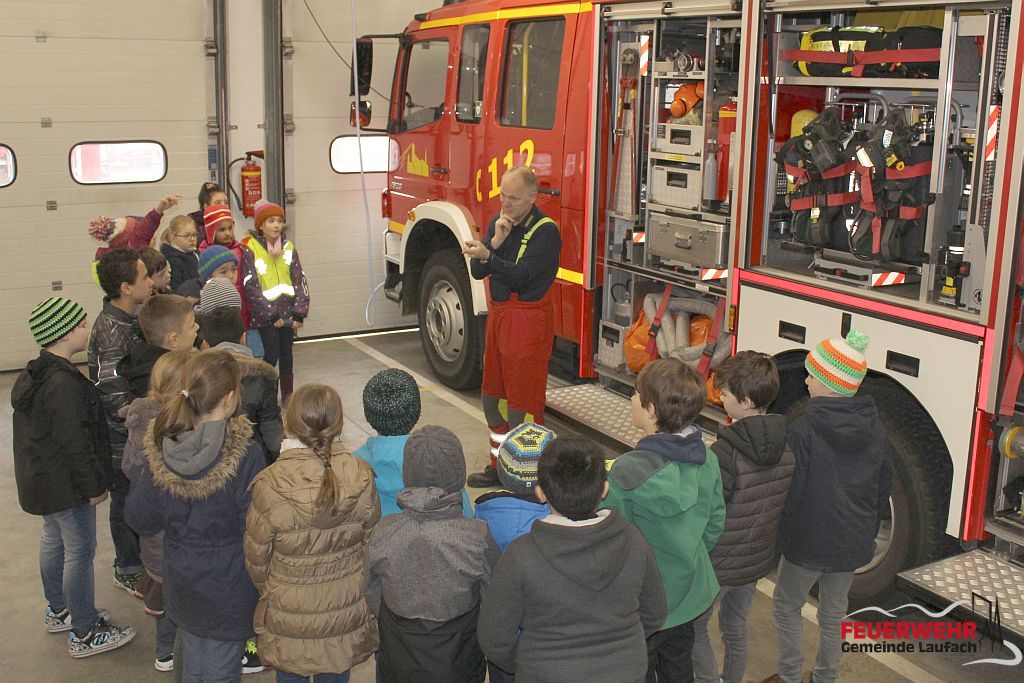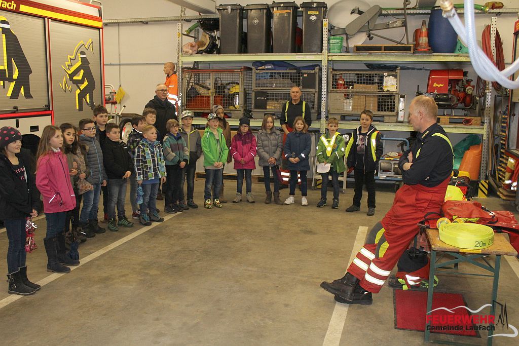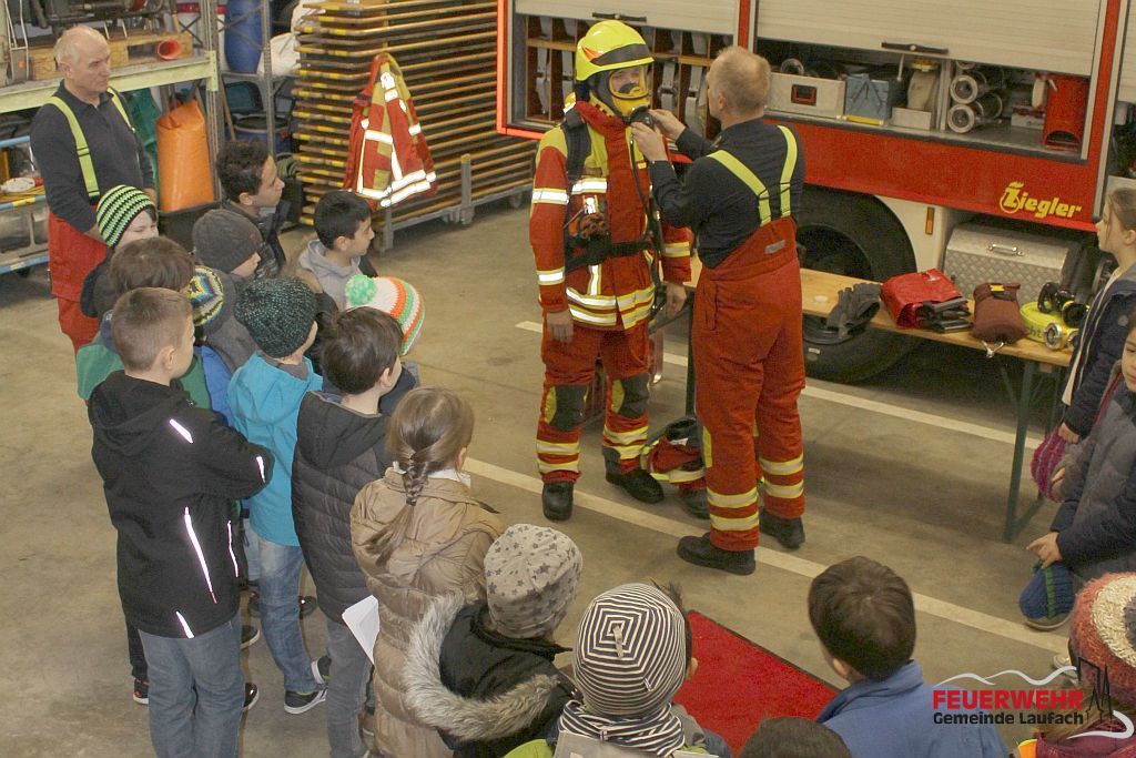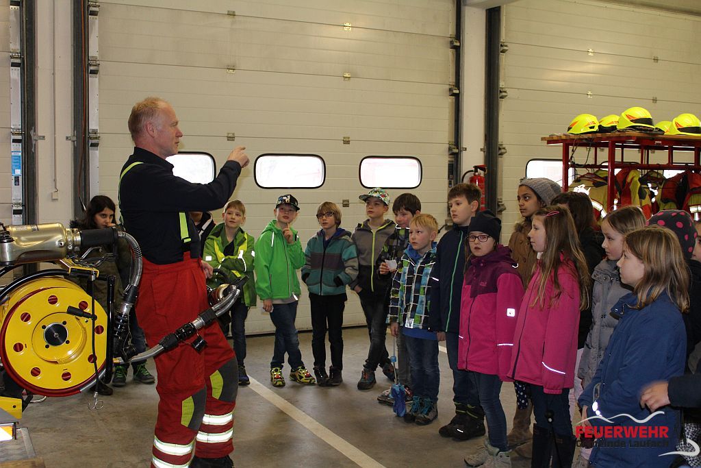 In Ergänzung des aktuellen Unterrichtsthemas „Feuer“ informierten sie sich vor Ort im Übergangsgerätehaus im Laufacher Bauhof über die Aufgaben und Ausrüstung der Wehr. Ein Team aus den Bereichen Öffentlichkeitsarbeit und Jugendfeuerwehr (Christian Strecker, Christian Franz, Sven Henze und Rigobert Schubert) erklärte den Kids die persönliche Schutzausrüstung, den Atemschutz, zeigte einige Besonderheiten im Gerätehaus und als Beispiel für die Fahrzeuge das Hilfeleistungslöschgruppenfahrzeug HLF 20/16.