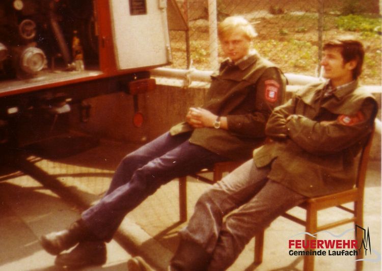 Ein Bild aus Huberts Anfängen in der Feuerwehr - mit dem späteren Kommandanten Albrecht Geis II (links) und dem alten TLF.