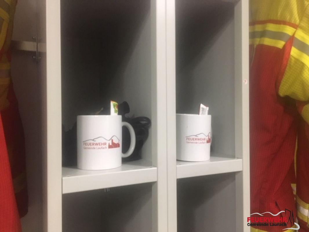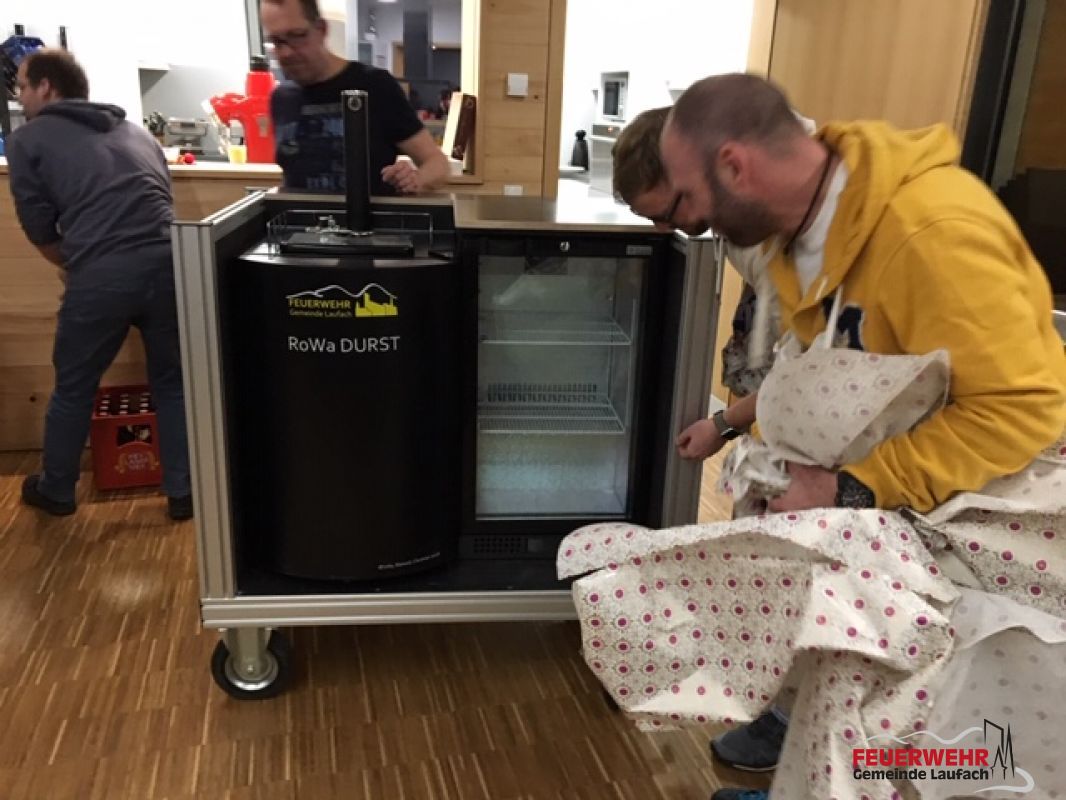 Zwei Geschenke gab es heuer auch vom Feuerwehrverein Laufach: zum einen wurde in jedem Spind eine Tasse mit Süßigkeiten gestellt. Zum anderen gab es als Überraschung für die Aktiven der FGL einen „RoWa DURST“ passend zum Rollwagen-Konzept. Basis ist ein Logiroll-Rollwagen der Fa. Schneider, der vom Aktiven und Mitglied der Vorstandschaft der Freiw. Feuerwehr Laufach e.V., Udo Harnischfeger, mit einem Kühlschrank, einer Zapfanlage mit Kühlmöglichkeit und einer Arbeitsfläche sowie einer Steckdose ausgestattet wurde.