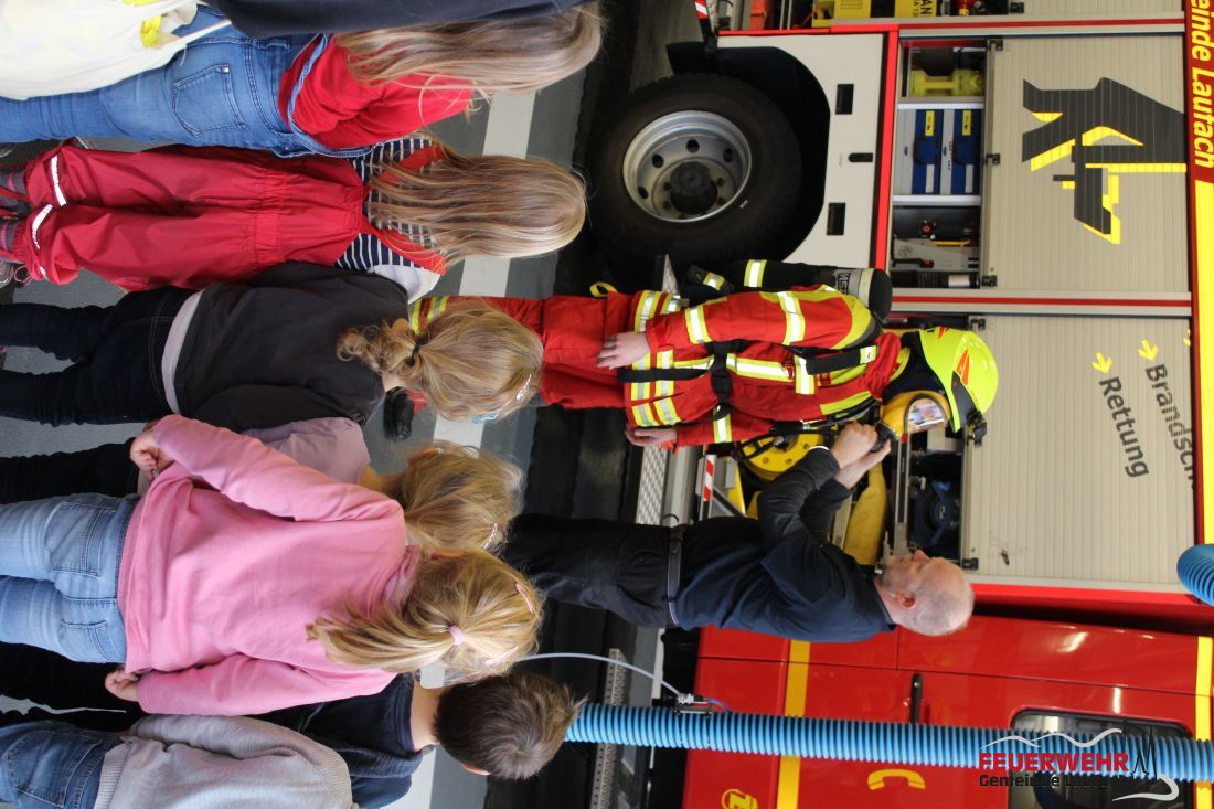 Sie wurden empfangen von einem kleinen Team der FEUERWEHR Gemeinde Laufach, bestehend aus Christian Strecker, Christian Franz, Rigobert Schubert und Johannes Franz. Die Kids konnten spielerisch die persönliche Schutzausrüstung kennenlernen, bekamen den Atemschutz erläutert, staunten über die große Halle, die vielen Bildschirme in der Funkzentrale und durften natürlich auch in kleiner Gruppe eine Runde im Feuerwehrauto mitfahren.