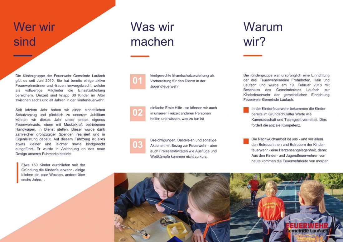 Die Kindergruppe der Feuerwehr Gemeinde Laufach gibt es seit Juni 2010 und somit seit 15 Jahren. Sie hat bereits einige aktive Feuerwehrmänner und -frauen hervorgebracht, welche als vollwertige Mitglieder die Einsatzabteilung bereichern. Sie war ursprünglich eine Einrichtung der drei Feuerwehrvereine Frohnhofen, Hain und Laufach und wurde am 19. Februar 2018 mit Beschluss des Gemeinderates Laufach zur Kinderfeuerwehr der gemeindlichen Einrichtung Feuerwehr Gemeinde Laufach.