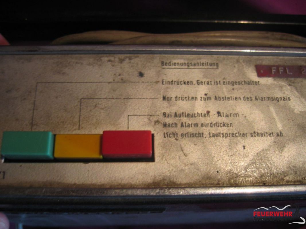 Bedienung des ersten Funkweckers Typ E1171. Man beachte neben der idiotensicheren Tastenerklärung auch die „Patina“ auf dem Gerät, das über mehr als zwei Jahrzehnte in der Werkstatt im Laufacher Gerätehaus stand