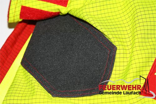 Damit müssen sich die Laufacher Bürger auch an einen neuen Anblick ihrer Feuerwehr gewöhnen: Die Grundfarbe der neuen Anzüge ist nämlich Rot - hinzu kommt ein leuchtgelbes Schulterkoller sowie Reflexstreifen in Gelb und Silber. So konnten die Anforderungen für Warnkleidung nach Anhang B der DIN EN 469:2007-02 erfüllt werden – der Anzug ist somit im Feuerwehreinsatz warnwestenbefreit. Ein großer Unterschied zu den bestehenden Anzügen, die überwiegend schwarz bzw. dunkelblau waren.