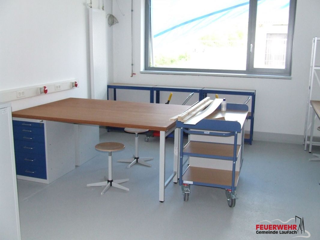 In den Werkstätten wurden die Werkbänke, Tische, Hängeschänke sowie die Schränke und der Stiefelwaschplatz im Gerätelager montiert. Selbiges gilt für die beiden Quattro-Ladestationen der Fa. Pölz in der Fahrzeughalle.