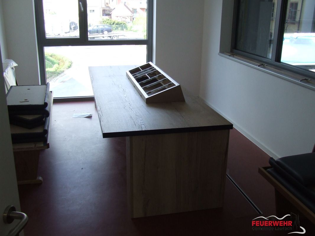 Die Fa. Heeg konnte somit die Arbeiten an der Theke und am Funktischkorpus endlich weiterführen bzw. nahezu abschließen. Lediglich die Eckbank konnte wegen des Bodenbelags jedoch noch nicht gestellt werden.