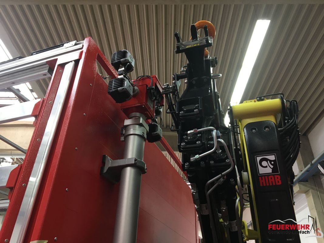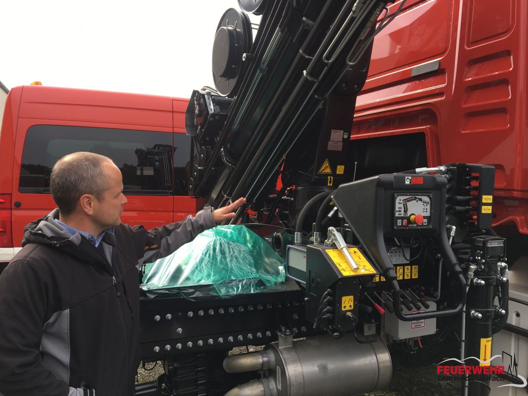 Hensels Verkaufsberater Benedikt Hettrich von Hensel und Stefan Wadlraff von der Fa. Zanner erläuterten Details des Kranaufbaus am Fahrzeug der Fa. Sennfeld, das parallel mit unserem V-LKW gebaut wird, bei dem jedoch die Pritsche noch nicht montiert ist.