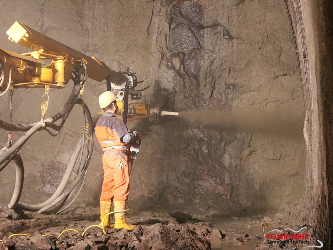 eigentliche Tunnelvortrieb gelegt. Natürlich nutzen die Anwesenden die Gunst der Stunde um die Betonspritzmaschine an der Ortsbrust in Augenschein zu nehmen und in Aktion zu erleben.